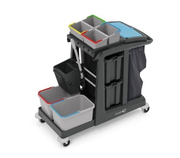 Duży wózek do sprzątania EM3 SRK16 SRK21 angielskiej marki NUMATIC przeznaczony jest do wielofunkcyjnej pomocy w czyszczeniu małych powierzchni. Wyposażony jest w wyciskarkę doczołową, 3 wygodne półki z praktycznymi akcesoriami a także uchwyt na worek do śmieci z pokrywą do worków 120L lub 2x70L. Wózek doskonale sprawdza się w niewielkich pomieszczeniach o ograniczonej dostępności np. w wąskich korytarzach, czy między szafkami szkolnymi.