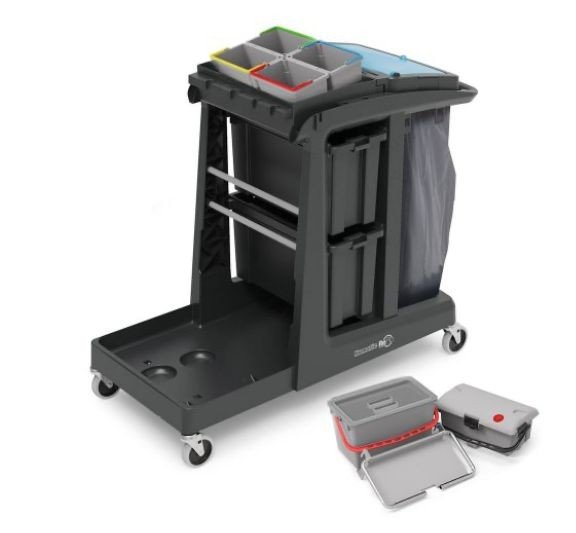 Duży wózek do sprzątania EM5 SRK17 SRK21 angielskiej marki NUMATIC przeznaczony jest do wielofunkcyjnej pomocy w czyszczeniu małych powierzchni. Wyposażony jest w zestaw wiader do dezynfekcji, 2 wysuwane kuwety, a także uchwyt na śmieci z pokrywą do worków 120L lub 2x70L. Wózek doskonale sprawdza się w niewielkich pomieszczeniach o ograniczonej dostępności np. w wąskich korytarzach.