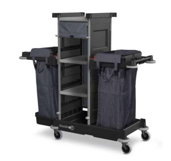 Wielofunkcyjny, wysoki wózek do obsługi hotelowej NKS2R angielskiej marki NUMATIC przeznaczony jest do transportu i przechowywania pościeli, ręczników a także galanterii hotelowej. Precyzyjne, skrętne koła oraz odbojniki zapewniają doskonałą pracę wózka również w niewielkich pomieszczeniach o ograniczonej dostępności np. w wąskich korytarzach, windach czy na podjazdach lub rampach. Worki (2x100L) ulokowane po bokach wózka służą do transportu brudnej pościeli lub ręczników.