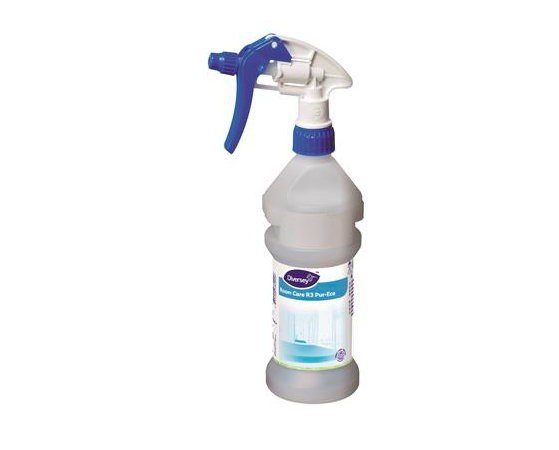 Pusta butelka ze spryskiwaczem do wielokrotnego użytku dedykowana do roztworu roboczego produktu Room Care R3 Pur-Eco. Pojemność 300 ml. Butelka posiada specjalny kształt który pasuje do dozowników Divermite®/Diverflow®.