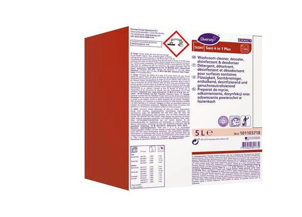 TASKI Sani 4in1 Plus to skoncentrowany preparat do mycia, dezynfekcji, odkamieniania oraz odświeżania wodoodpornych, zmywalnych powierzchni w toaletach. Polecany jest do twardych, wodoodpornych powierzchni (typu: toalety, umywalki, wanny, pisuary, kafelki, ściany). Przeznaczony do stosowania w obiektach typu: hotele, motele, restauracje, budynki biurowe, obiekty użytecznościpublicznej itp. Może być stosowany w obszarze medycznym.