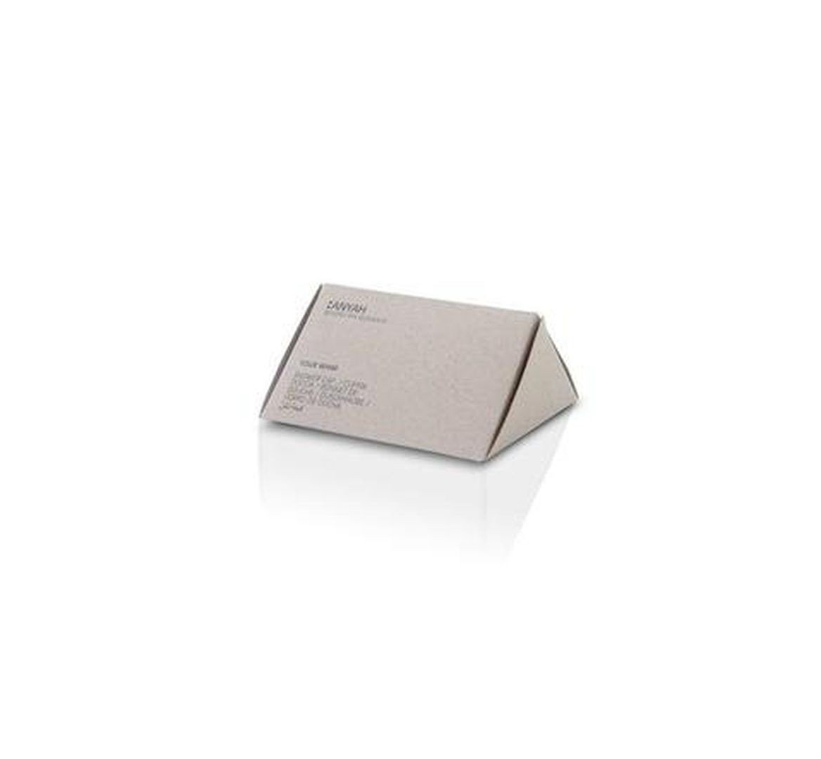 Opakowanie w kształcie graniastosłupa o podstawie trójkątnej, wykonane jest z papieru z recyklingu (85%) i masy papierniczej (15%), zadrukowane tuszem na bazie soi.