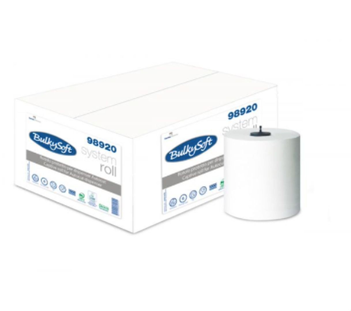 Ręcznik papierowy w roli autocut BulkySoft, 2 warstwy, wysokość 21 cm, średnica 19 cm, kolor biały, celuloza, długość 150m, 6 rolek/op.