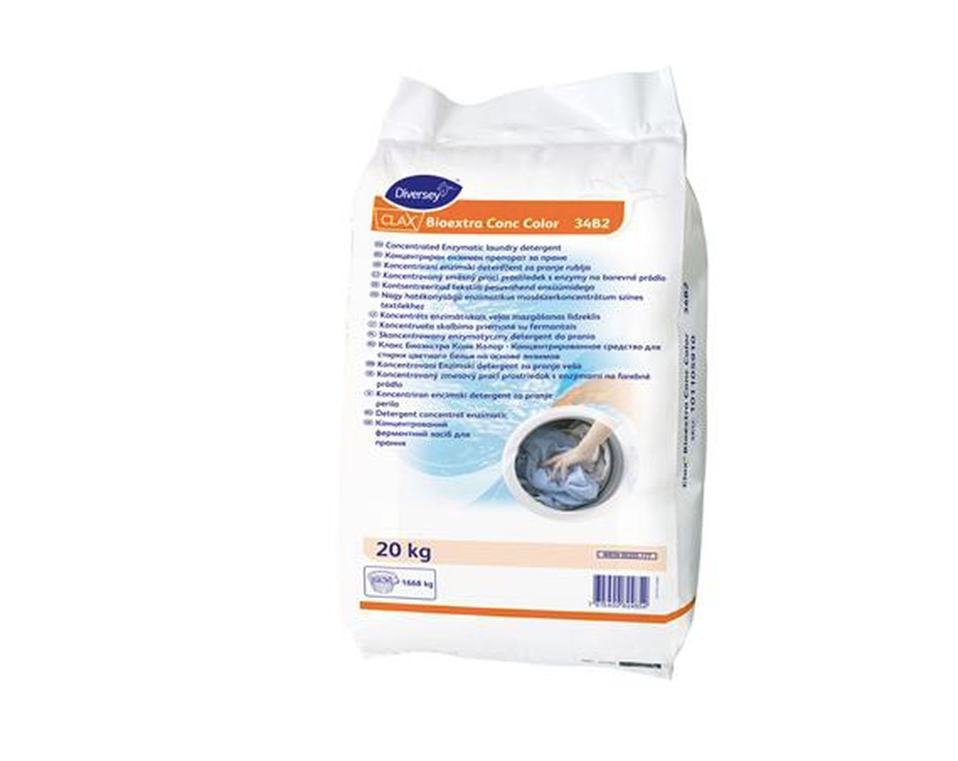 Clax Bioextra Conc Color to skoncentrowany, niezawierający fosforanów enzymatyczny detergent w proszku do użytku w pralniach komercyjnych i lokalnych, zapewniający doskonałą skuteczność czyszczenia i prania.